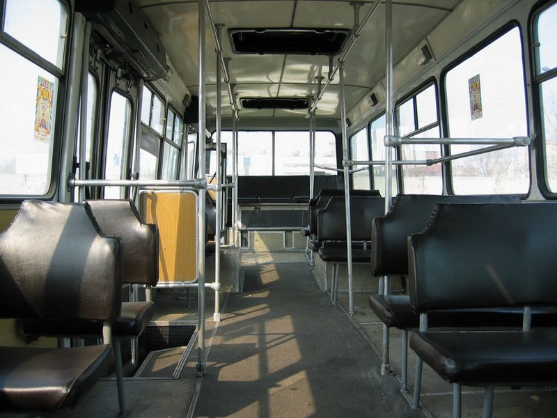 Салон "ЛАЗ-52523" поле капремонта. Не обошлось и без усовершествования сидений: вместо того, чтобы оставить поручни на боковых сиденьях, их решили убрать и всё сиденье завернуть винилискожей.