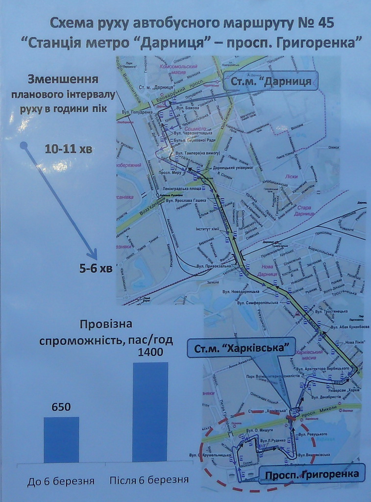 | 06.03.2012 | Автобусный маршрут №45 продлен от станции метро Харьковская до проспекта Григоренко, по улицам Ревуцкого, Вишняковского, Руденко, Мишуги. Схема: ![]() |