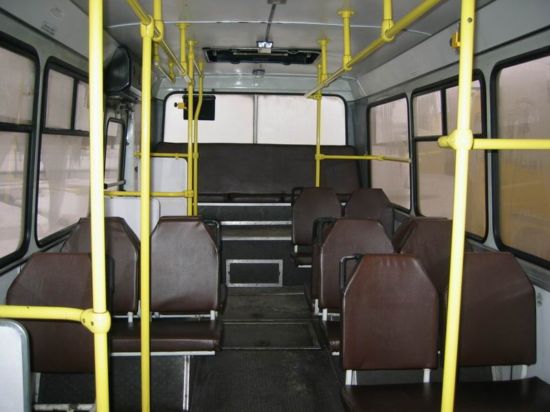 Салон "ЛАЗ-52527", из партии 2002 года. Вид на хвостовую часть салона. Компоновка салона по сравнению с предыдущей версией "ЛАЗ-52527" не изменилась: в хвостовой части слева по ходу движения находится 4*2 сидений, справа - 2*2+1 и сзади - 5. Всего в хвосте расположено 18 сидений. В передней части машины находится 10 сидений: слева - 6 и справа - 4. Всего в салоне расположено 28 сидений, общая вмсетимость - 97 пассажиров.
