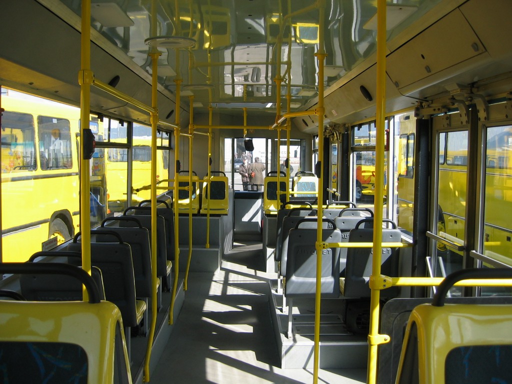 Богдан-А231 № 244-49 ТА "Экспоплаза", ул. Салютная, выставка "Автобус-2004" Салон первого А231 на выставке "Автобус-2004" в Киеве. Вид на две средние площадки.[Автор: Nick, 2004-04-03]