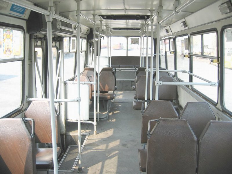 ЛАЗ-52523 № 1635 АП-6 Салон "ЛАЗ-52523" из второй партии (1998 год). Вид от кабины водителя. Вроде салон и широкий, а в час пик разминуться в нём довольно трудно.[Автор: Nick, 2003-04-24]