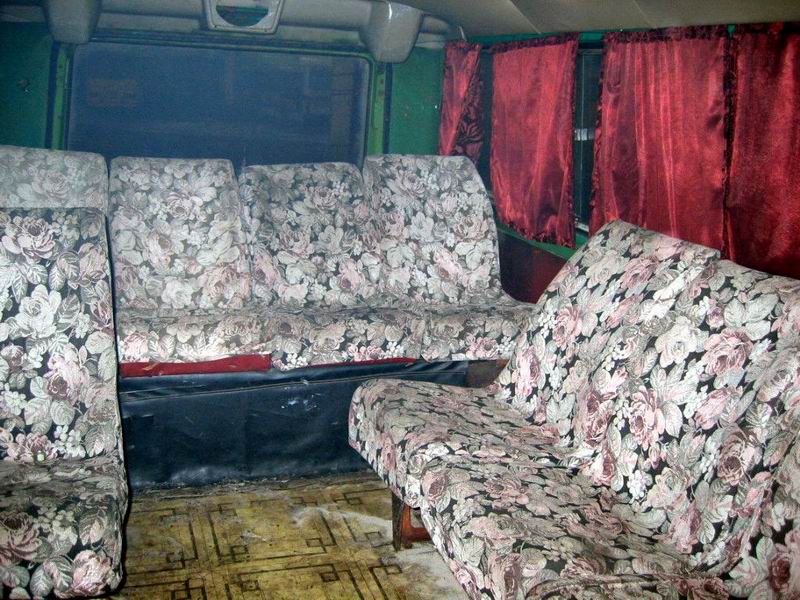 РАФ-2203 № 7103 КИБ АП-6 Компоновка салона - "маршрутное такси": сиденья стоят перепендикулярно ходу движения. Всего в задней части салона - 9 кресел, плюс ещё одно возле водителя.[Автор: Nick, 2004-01-13]