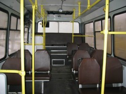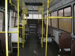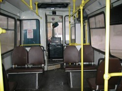 1617 155-83 КА Салон "ЛАЗ-52527". Вид с задних сидений. "Больное" место салона - наличие двойных сидений на передних и задних колёсах - затрудняет проход пассажиров в салон.